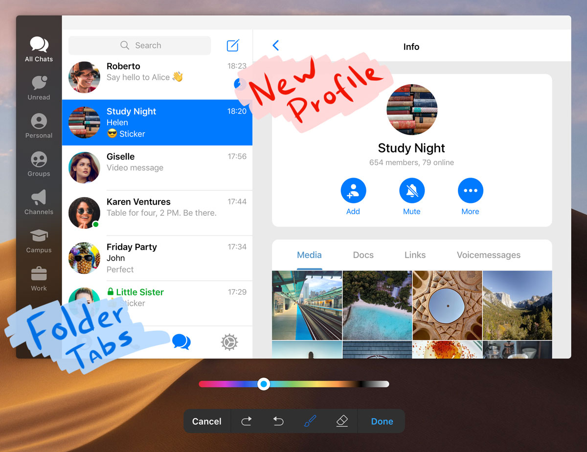 Maak je gebruik van Telegram voor macOS? Dan heb je nu toegang tot Gedeelde media direct vanuit de herontworpen profielpagina's. Maak je gebruik van veel mappen? Dan ben je vast wel blij met het nieuwe mappen zijpaneel met iconen in de stijl van Telegram Desktop.
