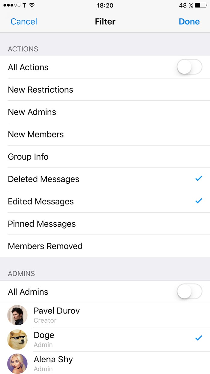 Recent actions in supergroups also show messages that were deleted in the last 48 hours and the original versions of edited messages for the same period, so nasty behavior like self-deleted spam will no longer help anyone escape the admins’ wrath.