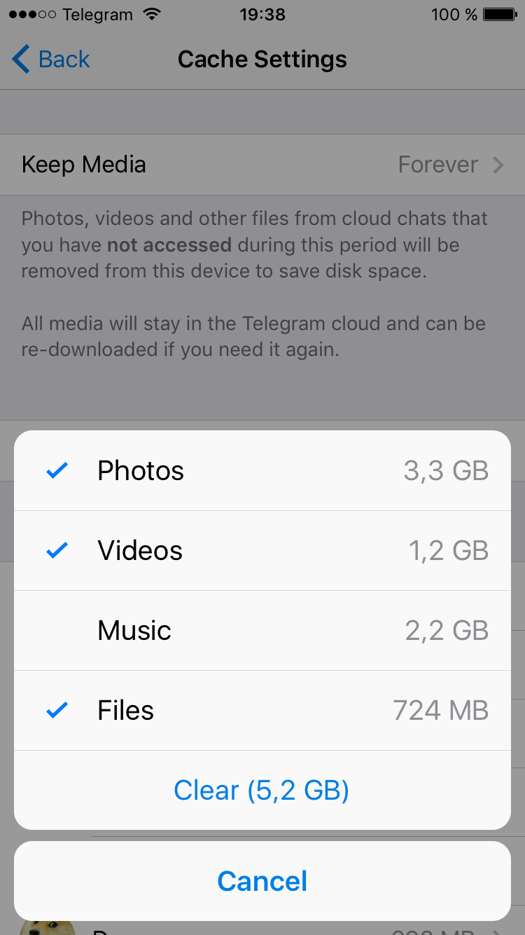 On iOS it is also possible to clear cached files on a chat-by-chat basis. On Android, this currently works with supergroups and channels (just tap and hold in the chats list, then ‘Delete from Cache’).
