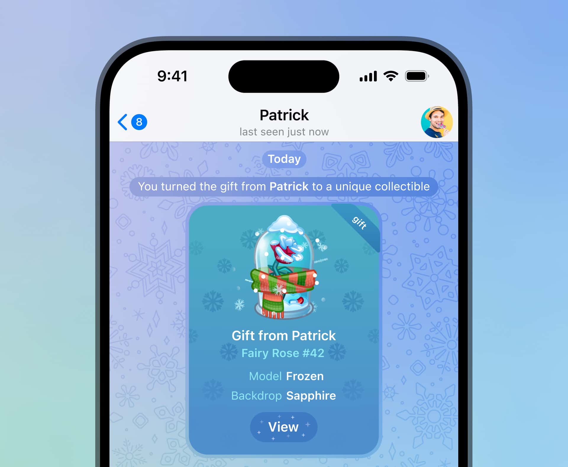 Apabila membeli hadiah untuk pengguna lain, anda boleh menghantarnya sebagai sudah dinaik taraf — dan melihat ketika mereka membuka karya seni terkumpul mereka terus dalam bual. Menaik taraf hadiah akan dikenakan bayaran kecil dalam bentuk Telegram Star, untuk menampung yuran blokchain.
