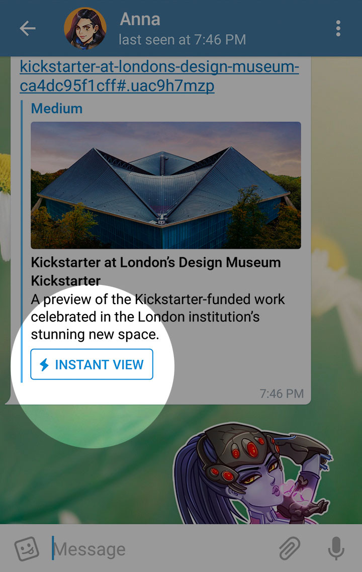 If you have feedback about the way an Instant View page was generated, ping our @previews bot. Only a handful of websites are supported at the moment, but we'll be adding more as we go. Eventually we want to provide Instant View pages for every story on the Web and thus devour the entire Internet (*evil laugh*).