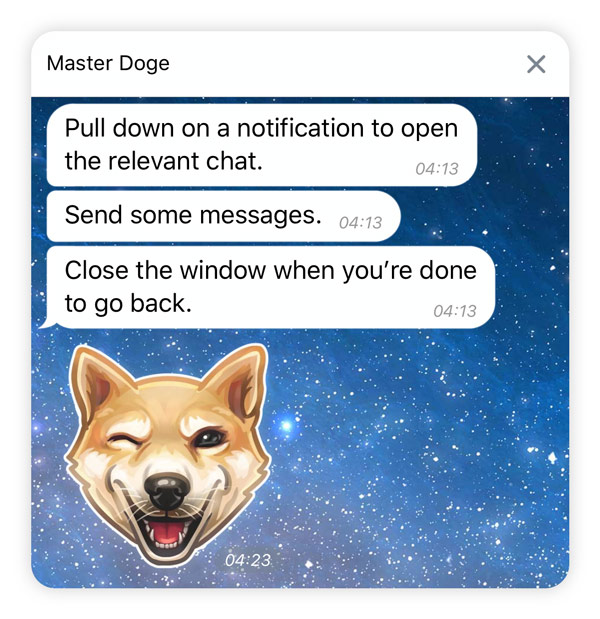 The new expandable in-app notifications will help you focus on whatever you‘re doing in the app without having to ignore incoming messages. When a notification arrives, pull it down to open the relevant chat. When you’re done with the interruption, simply close it to get right back to what you were doing.
