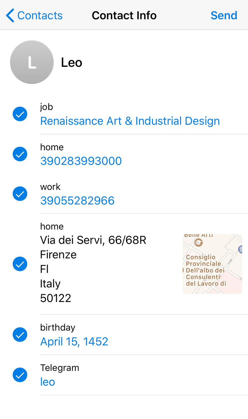Sometimes you want to share more info about a contact than just one number. With this update, you can select what data you want to send when sharing a contact. For example, several phone numbers or other vCard fields.