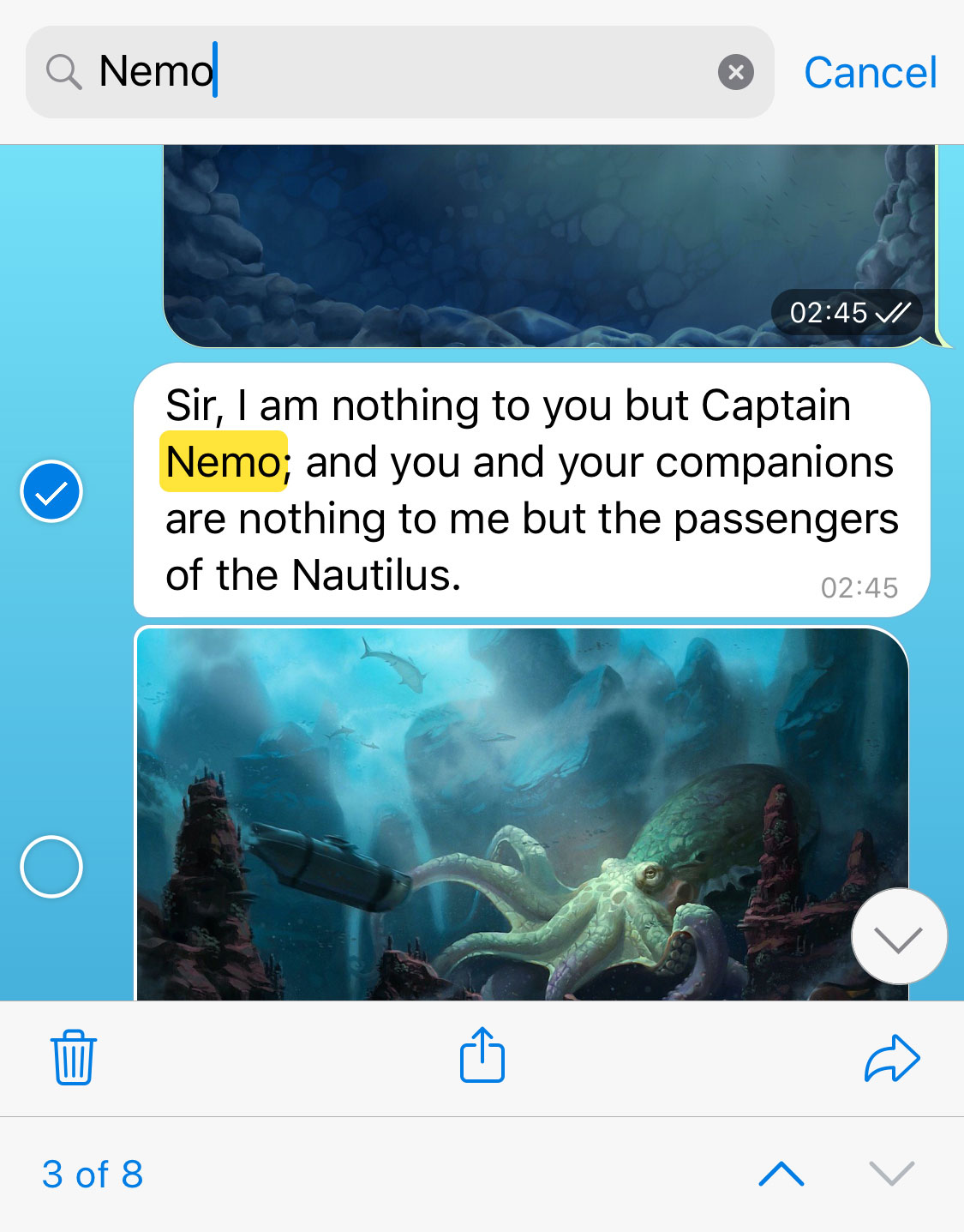 Screenshot showing several messages selected in a chat on iOS – without leaving the Search Mode.