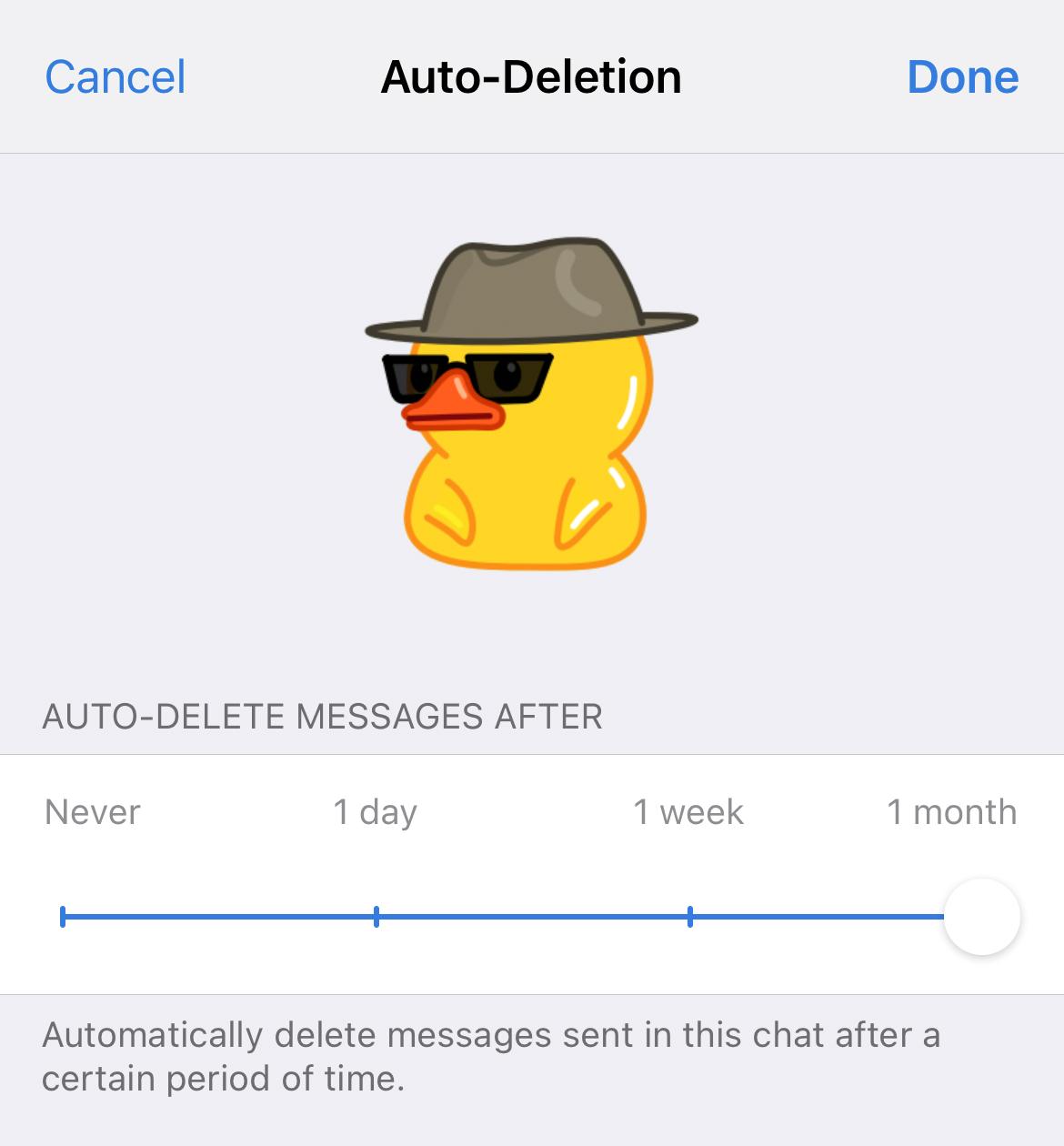 Pesan di obrolan dapat diatur untuk dihapus secara otomatis setelah 1 hari atau 1 minggu dan sekarang tersedia pilihan 1 bulan, untuk lebih bersiap agar percakapan Anda hilang saat bulan purnama tiba.