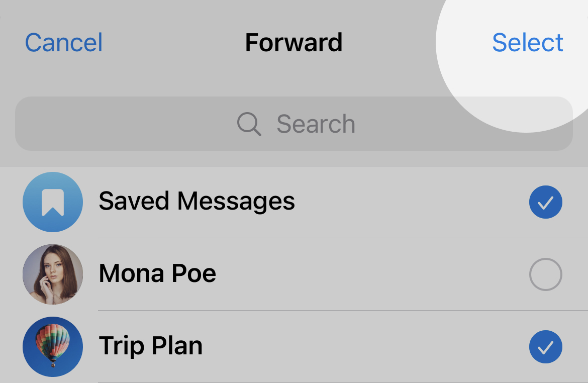 Teruskan pesan untuk beberapa penerima dengan mengetuk 'Pilih' di menu terusan. Sekarang membagikan meme terbaik lebih mudah dengan semua teman terbaik Anda.