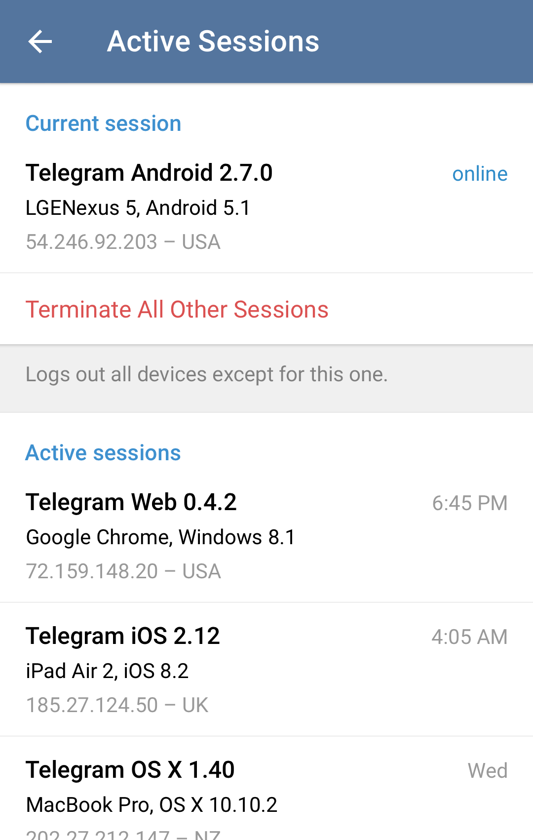 Today's Telegram update, in addition to rich link summaries, adds Active Sessions to your Privacy and Security settings. This screen shows all your logged in devices with IP info. You can also close any sessions that are outdated or (God forbid!) suspicious.