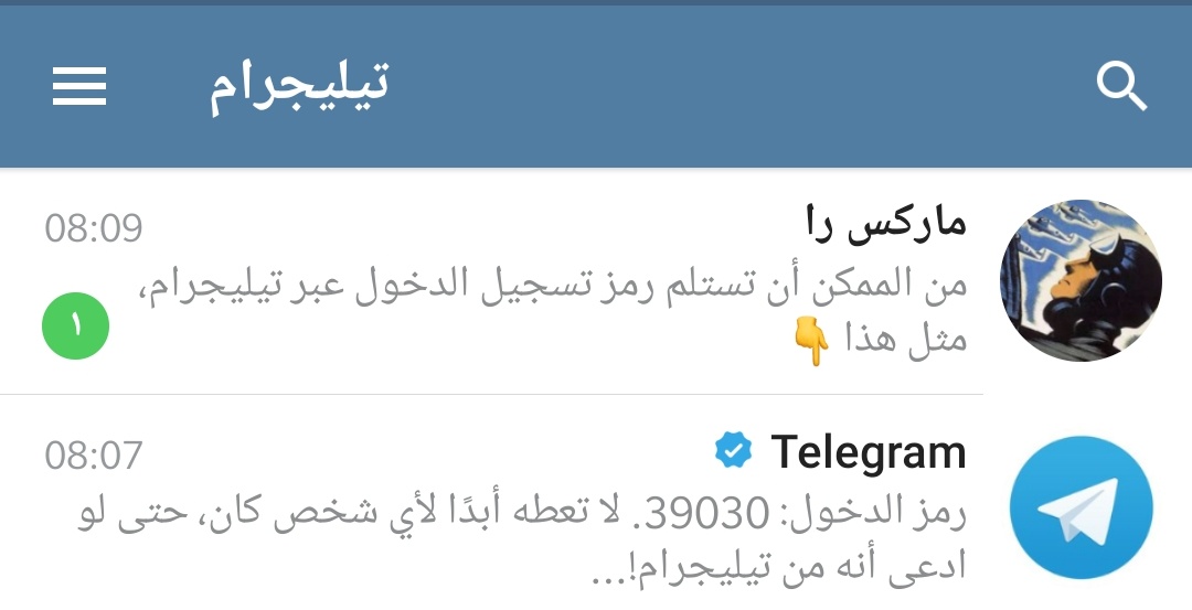 لاستلام الرمز بهذه الطريقة ماعليك سوى تفقد تيليجرام من أحد أجهزتك المتصلة. ستجد الرمز في محادثة حساب تيليجرام الموثق بالإشارة الزرقاء: